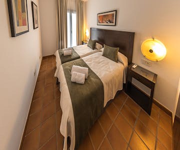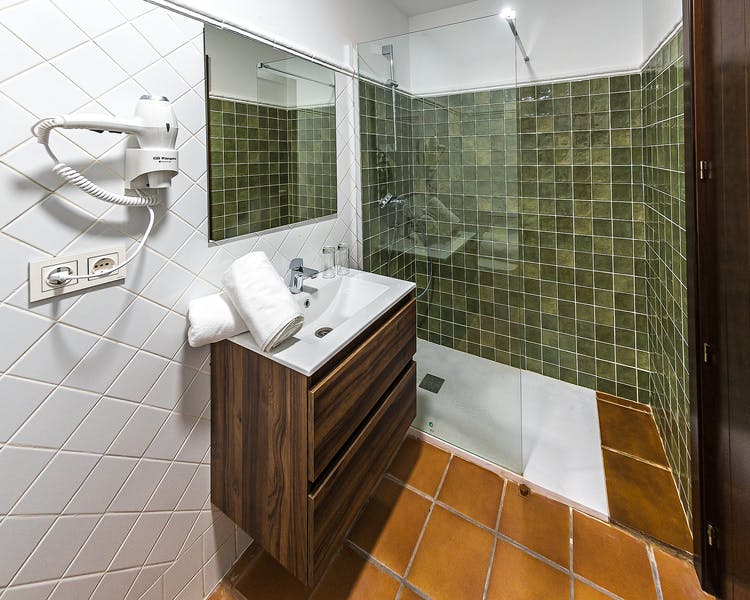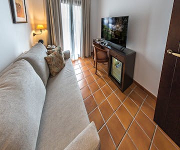If you are looking for comfort, rest, enjoying the tranquility of the Sierra in a larger space and unparalleled views of the Almonaster Mosque and the Sierra de Aracena y Picos de Aroche Natural Park. The Suite with balcony at IC-Hoteles Casa García Almonaster la Real offers all that and much more. This cheerful room has a cozy and modern space in which we put at your disposal a large bedroom with two single beds, a living room with a sofa bed, and two large bathrooms with a shower.